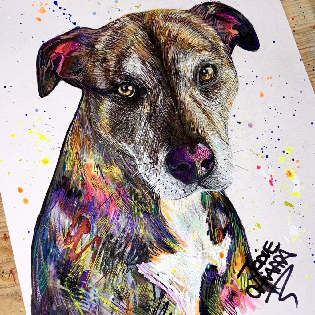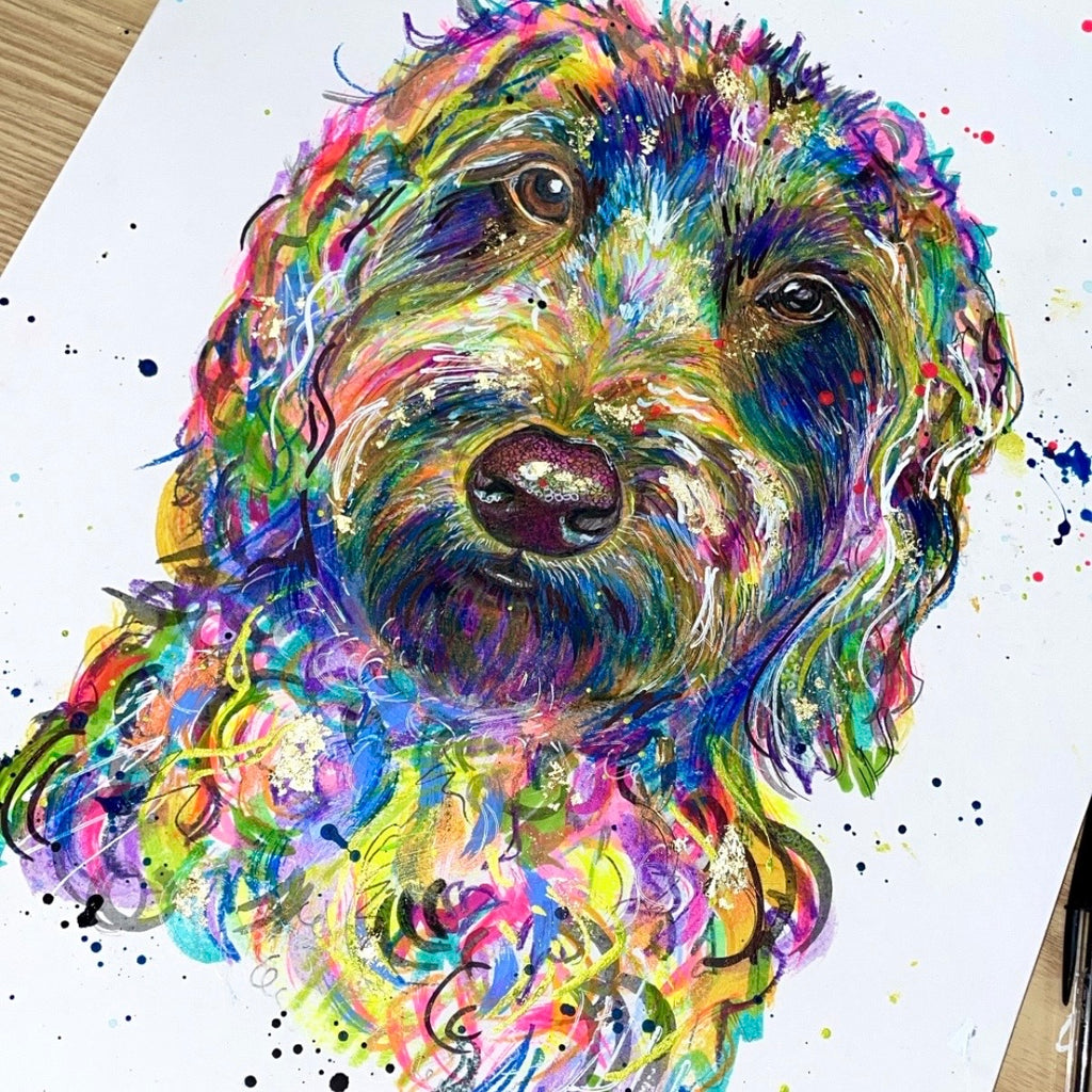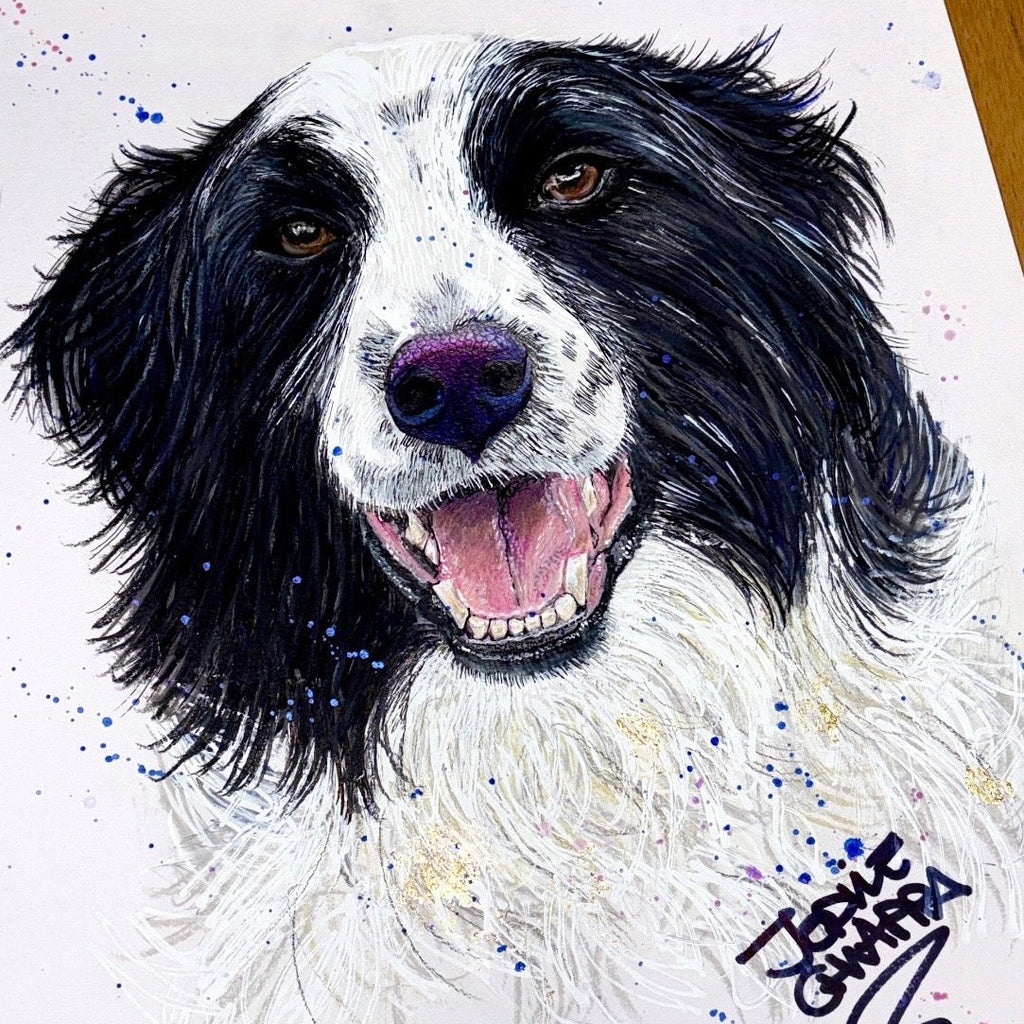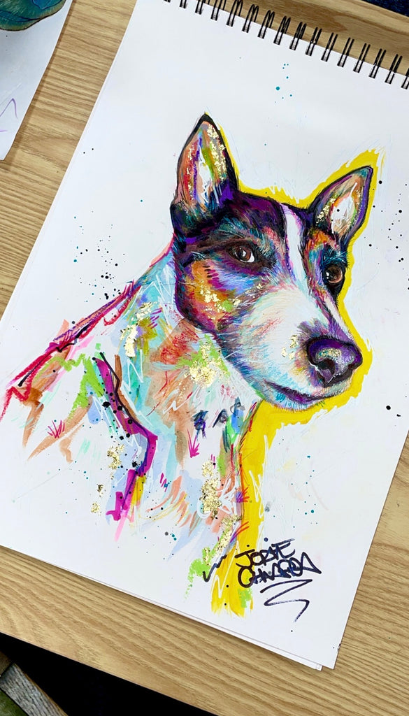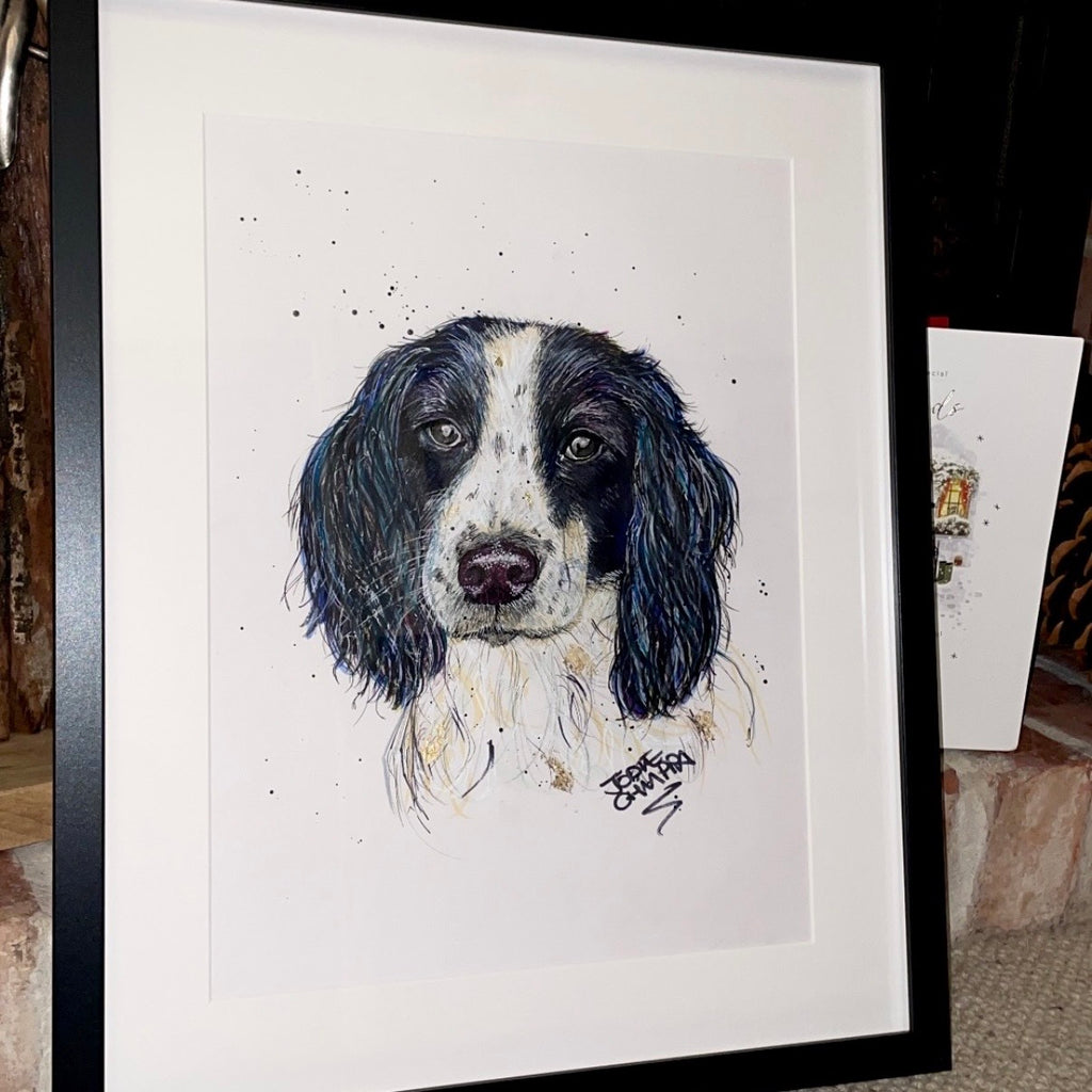 Dog portraits are painted on A3 card which fits in a 40cm x 50cm frame.